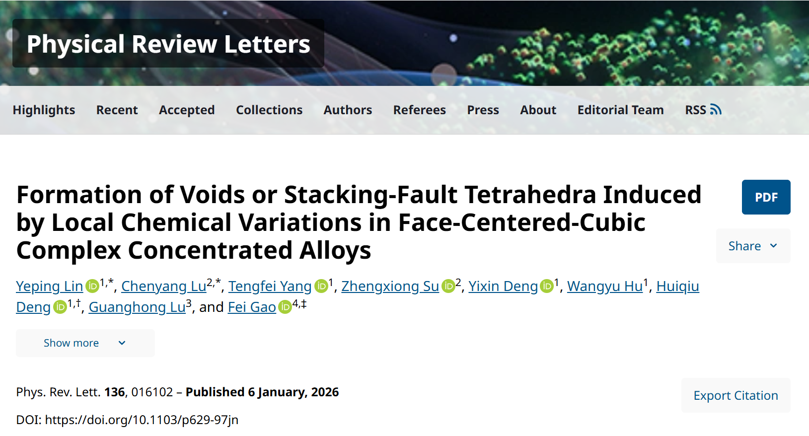 研究成果以“Formation of Voids or Stacking-Fault Tetrahedra Induced by Local Chemical Variations in Face-Centered-Cubic Complex Concentrated Alloys”为题发表在物理学权威学术期刊《物理评论快报》(Physical Review Letters)2026年第一期上。湖南大学物理与微电子科学学院为该论文第一完成单位,物电院在站博士后林也平(模拟计算)和西安交通大学卢晨阳教授(实验验证)为共同第一作者,邓辉球教授和美国密歇根大学Gao Fei教授为共同通讯作者。湖南大学材料院杨腾飞教授和北京航空航天大学吕广宏教授等也在实验分析方面做出了重要贡献。该工作得到国家磁约束核聚变能发展研究专项和国家自然科学基金等项目的资助。